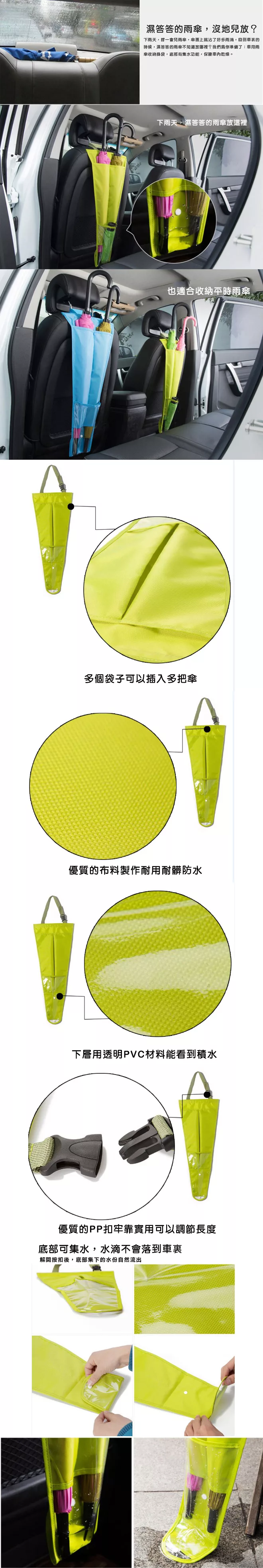 本款車用椅背防水雨傘收納袋,讓你雨傘可以懸掛在椅背後不佔空間且不會弄濕地毯,保持車子內部的乾燥!